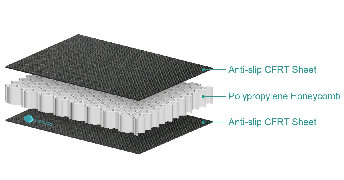 TOPOLO thermoplastic anti-skid honeycomb panels are made of PP (honeycomb) honeycomb core and CFRT (continuous fiber reinforced thermoplastic) sheets. CFRT material is strong and durable and is an ideal anti-slip material. CFRT sheets are made of multiple layers of UD tapes laminated at different angles, and then extruded through a roller with a non-slip embossed texture. With the pursuit of lightweight in various industries, thermoplastic anti-slip honeycomb panels replace wooden floors and metal floors and are used in many industries.
