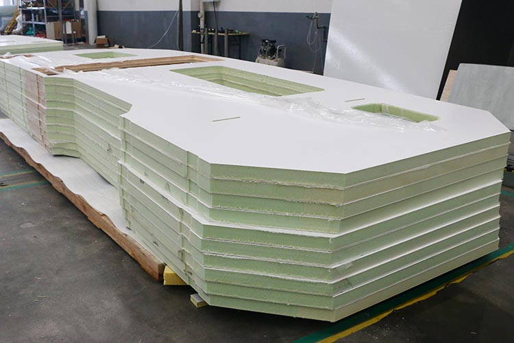 The skin of fiberglass foam panels is FRP material, and the FRP material can be thermoset FRP sheet or thermoplastic CFRT sheet; the middle core material is foam board, usually made of XPS, PET, PVC, EPP, PU, MPP, and other foam boards. The skin and core are held together by compression molding using high-quality glue.