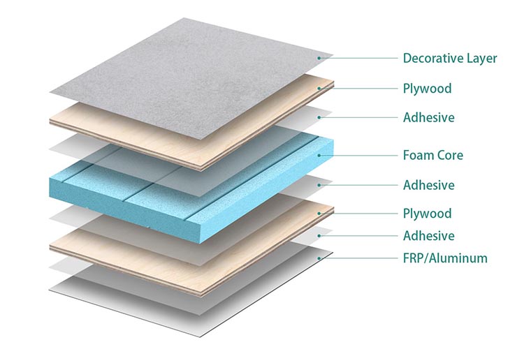 Compared with pure plywood, composite plywood foam core panel greatly improves the utilization rate of plywood wood. It is used in construction, trucks, RVs, ships, trains and more. TOPOLO’s composite technology makes the service life of composite plywood foam core panels much longer than that of pure plywood.