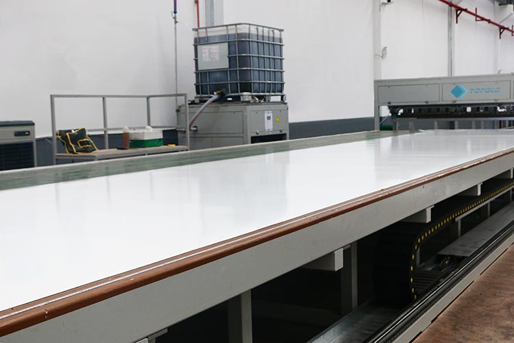 The highly flat positioning platform can quickly assemble embedded parts. The accuracy error of embedded parts is within 0.2 mm, and the panels produced are very flat. It is also a platform for testing the flatness and defects of the core material. This platform is particularly suitable for manufacturing sandwich panels that require reinforcement materials to be embedded inside, such as RVs, refrigerated trucks, dry trucks, mobile homes, etc.