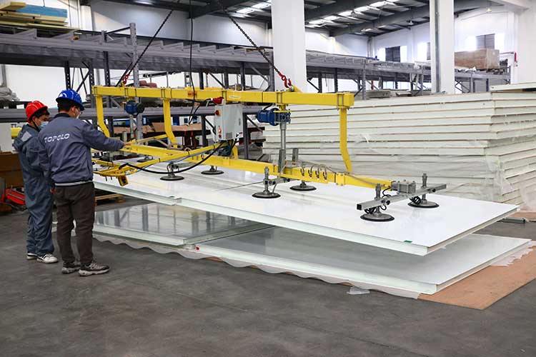 The lifting capacity of the suction cup spreader is up to 2 tons. Using the suction cup spreader can not only quickly transport the sandwich panels, but also avoid panel damage and protect the edges and surfaces of the panels.